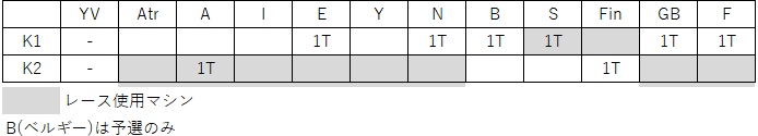 レース毎にK1、K2どちらが使用されたか整理したのが次表。「1T」はプラクティスでゼッケン1の横にTが追加されていたことが確認できたもの。