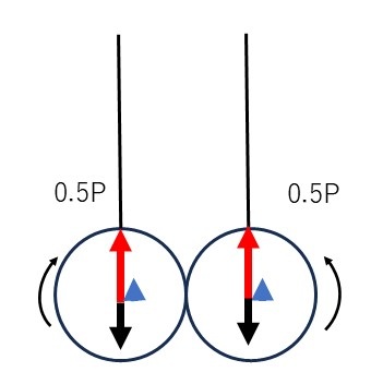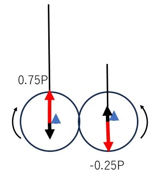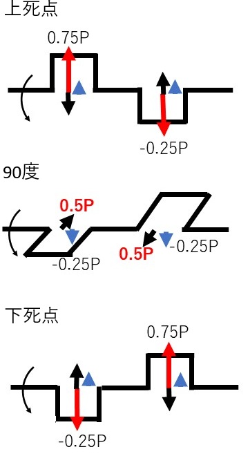 クランク半径/コンロッド長を1/4、上死点での1次慣性力をPとすると、上死点、90度/270度回転、下死点での慣性力は次の表のとおり(上死点方向がプラス、下死点方向がマイナス)。
