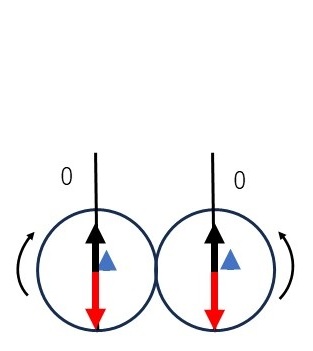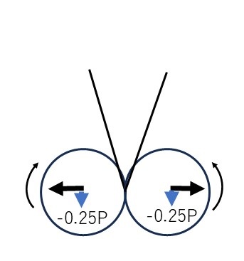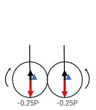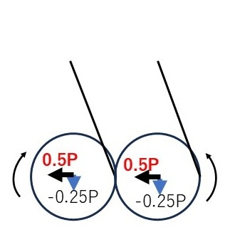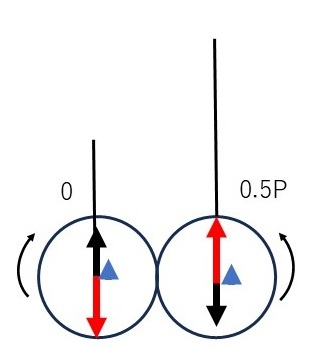 赤矢印:1次慣性力 黒矢印:バランスウエイトの遠心力(絶対値=0.5P) 青矢印:2次慣性力(0.25P又は-0.25P) 例えば上死点の「0.75P」は P(1次慣性力) + 0.25P(2次慣性力) - 0.5P(バランスウエイト遠心力) 「-0.25P」は -P(1次慣性力) + 0.25P(2次慣性力) + 0.5P(バランスウエイト遠心力) を示す。 1次慣性力のみであれば、0.5P×L(ボアピッチ)の偶力がクランクシャフト回転により向きを変えるだけだが、2次慣性力を加えると1次慣性力のみとは異なる印象を受けるだろう。 |