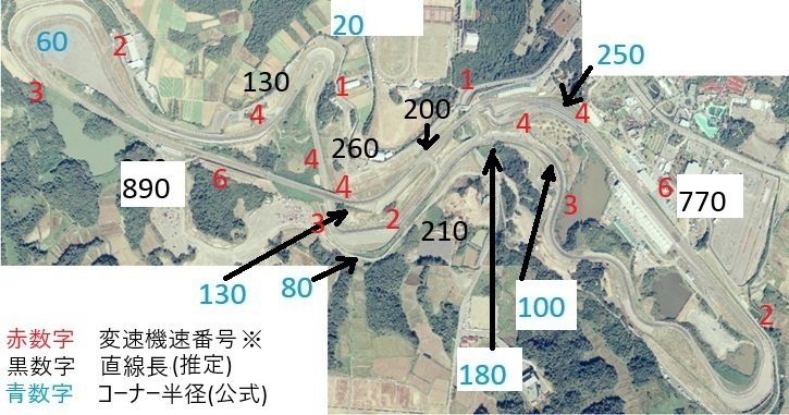 もてぎのダウンヒルストレートでの加速距離は650m程度と思われるが、その手前のヘアピンは30R・180度の低速コーナーであり、その脱出速度の直線タイムへの影響は鈴鹿のスプーン(60R・110度程度)に比べると小さい。
